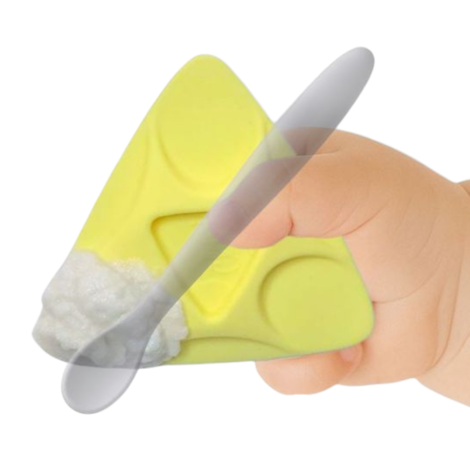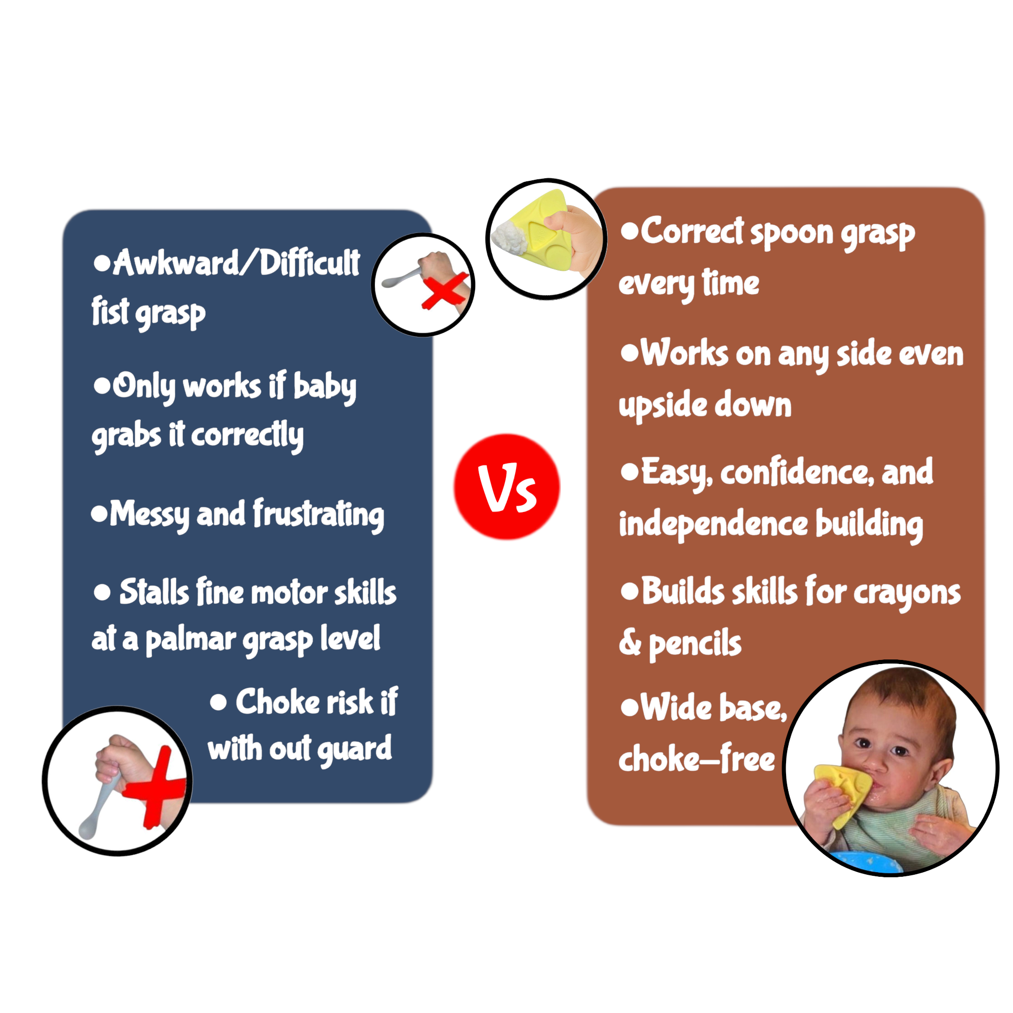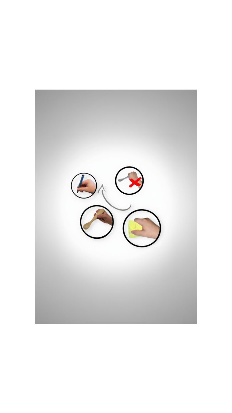 Traditional baby spoons keep babies using a fist grip (Palmar Grasp/ 6mo - 9mo level), which does not grow into a tripod grasp.